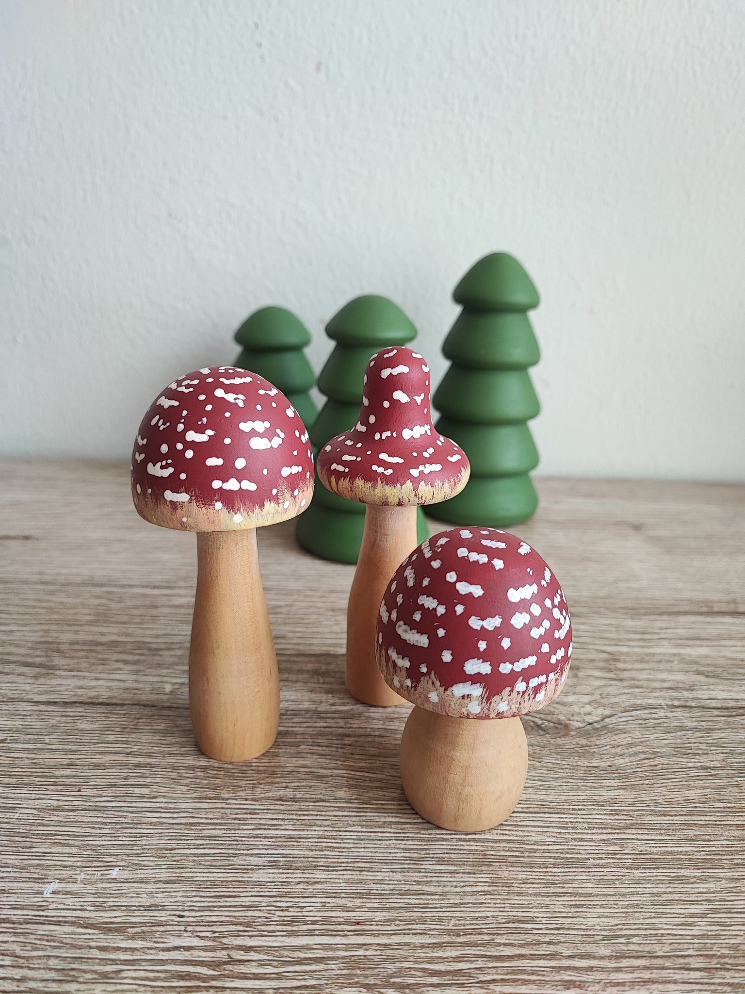 .Este set de tres amanitas de madera, pintadas a mano una por una, está inspirado en la Amanita muscaria, uno de los hongos más emblemáticos del bosque.